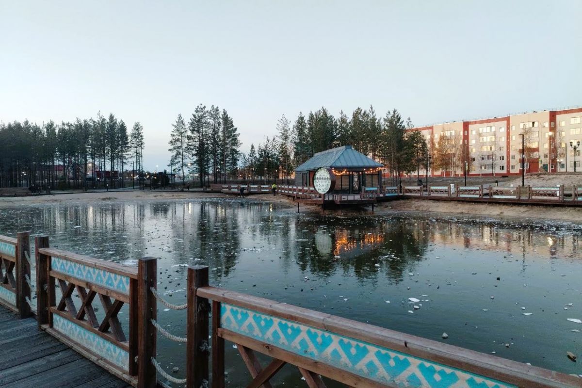 Ключевым элементом «Тёплого берега» является арт-объект «Великий бубен», символизирующий единство с историей северного края. Кроме того, на всей территории установили беседки-барбекю, стилизованные под чумы, и многоуровневое освещение, в котором использованы светильники в виде хантыйских орнаментов.