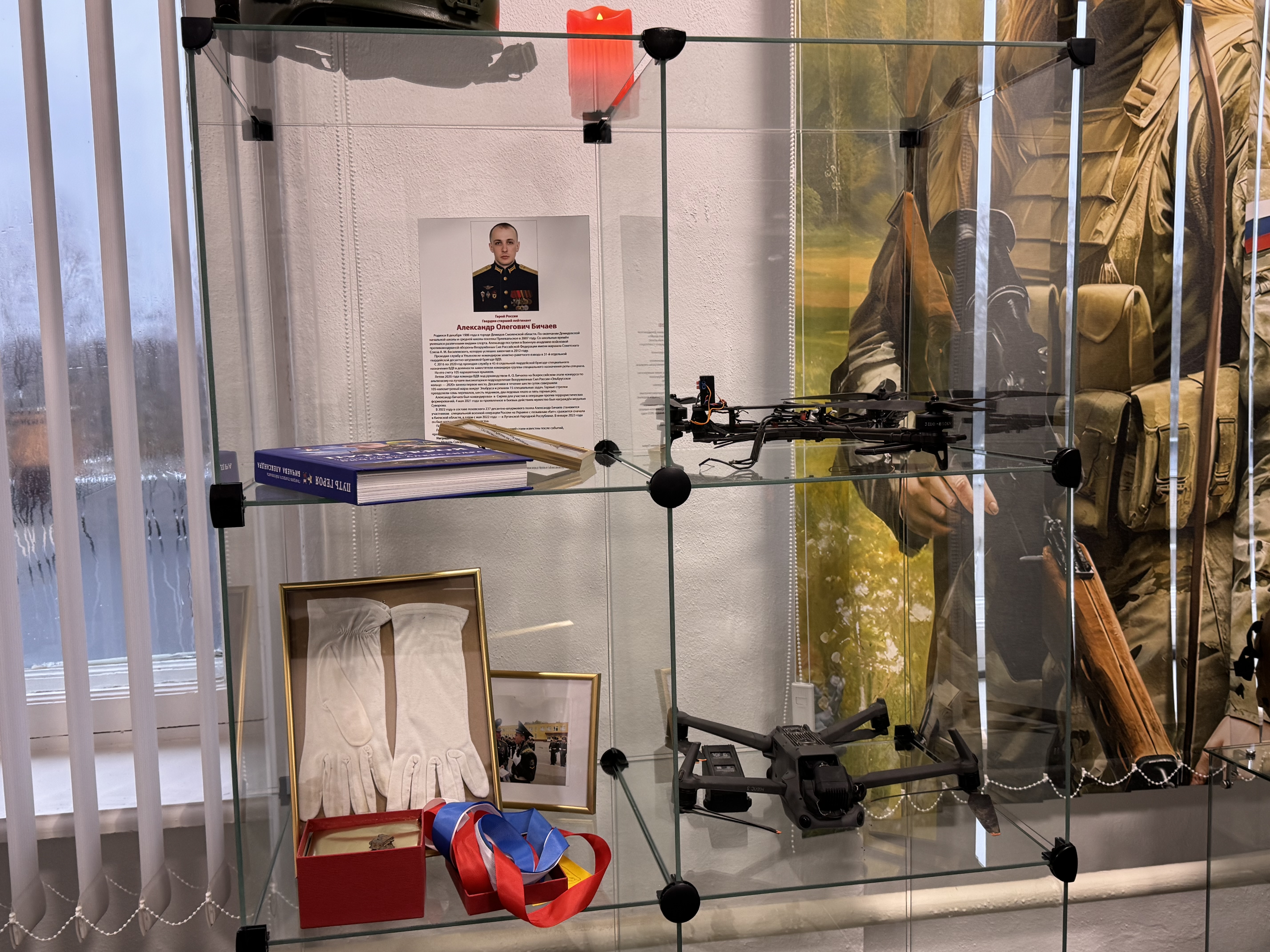 Рядом с фронтовыми реликвиями 1940-х годов разместили сбитые дроны, амуницию, шевроны и личные вещи бойцов, переданные из зоны проведения специальной военной операции.