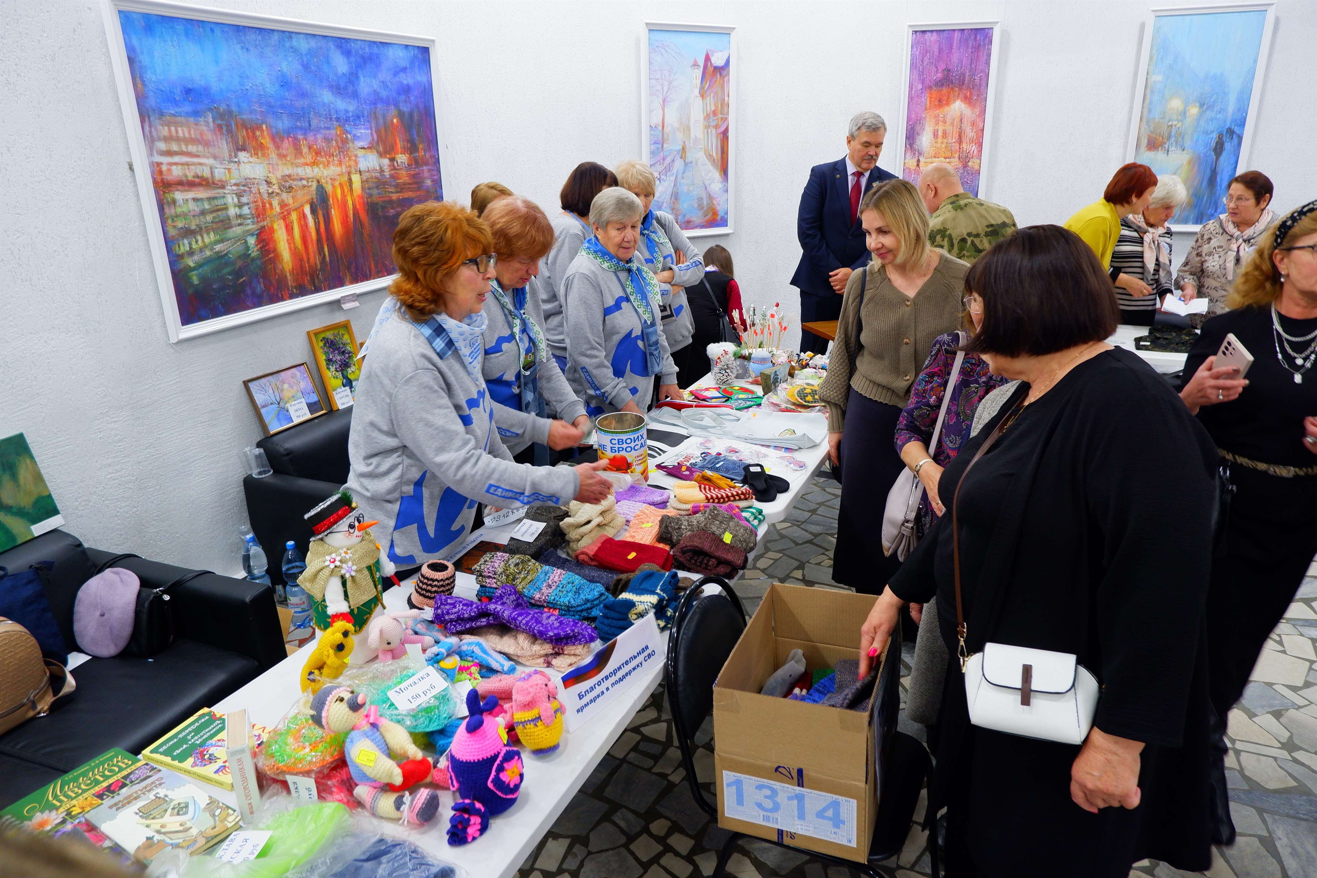 Для гостей работала выставка «Герои нашего города» с фотопортретами участников СВО. Активистки группы «Неравнодушные сердца» «Женского движения Единой России» устроили ярмарку изделий ручной работы, на которой все желающие могли приобрести мыло и свечи, детские тёплые балаклавы, значки с Георгиевской лентой, сумочки и многое другое.